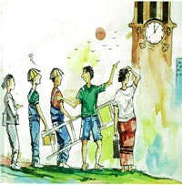 ついに、分の針と秒の針のふたりはへとへとになり、時間の針に「前と同じように普通の速さで動いてくれ」と頼みました。