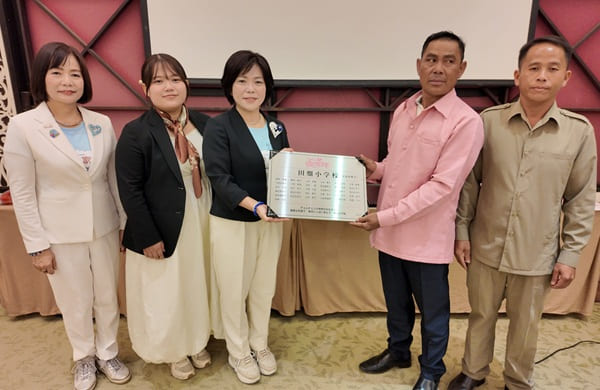 まずは糸谷沙恵子1%クラブ代表や田畑キャプテン、田畑小関係者がお互いにご挨拶。さらに校舎へはめ込む記念の銘板を贈呈し、日本とラオスの絆の深さを確かめ合いました。