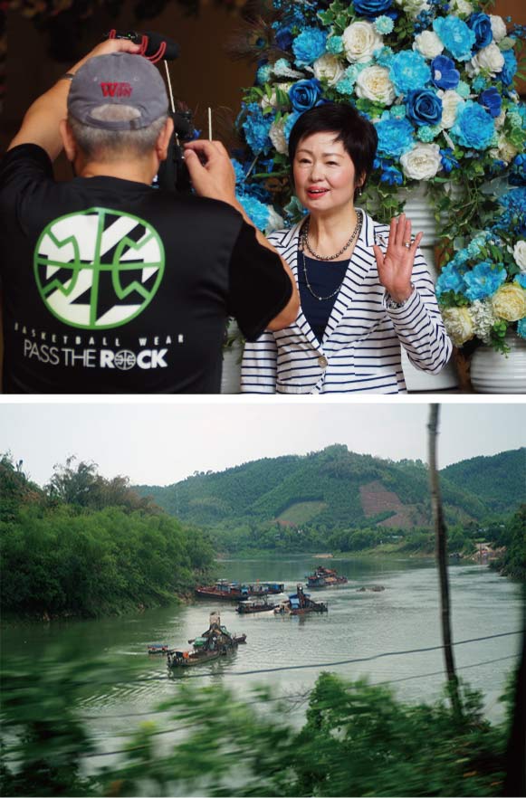 アジサイを背にした撮影(写真㊤)から約1時間。途中、山あいを流れる川で、砂利を採取する船などを見やりながら(写真㊦)、バクザン省の小さな村に出来た「カズコ小学校」へ。雨は上がり、太陽が輝き始めていました。