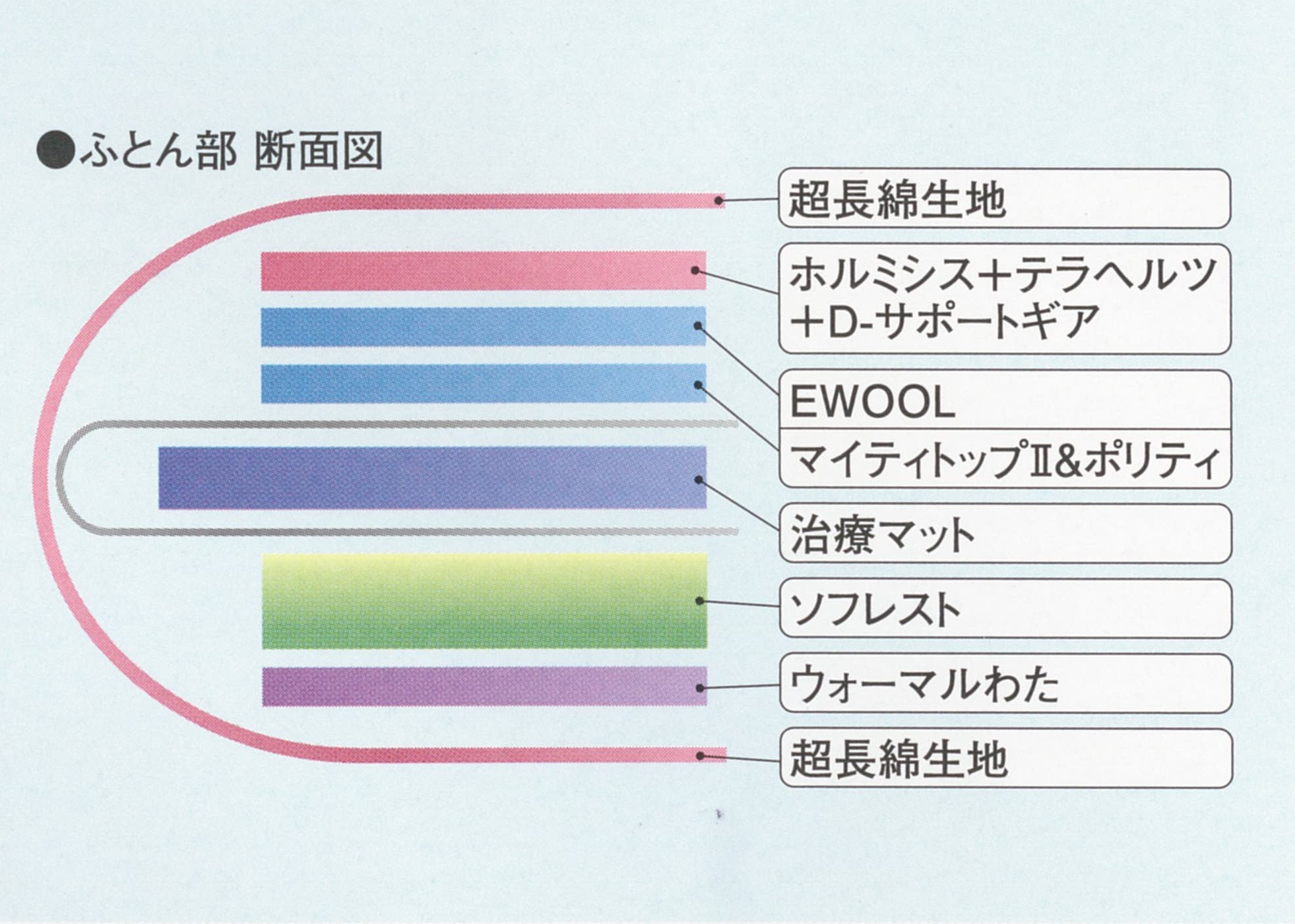 治療部の各プログラムはもとより、布団部には心地良い眠りをサポートする機能性素材をふんだんに使用。(例:ホルミシスシートなど)