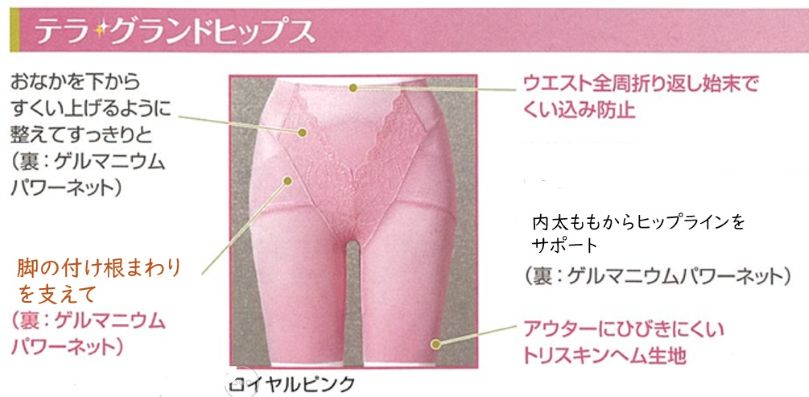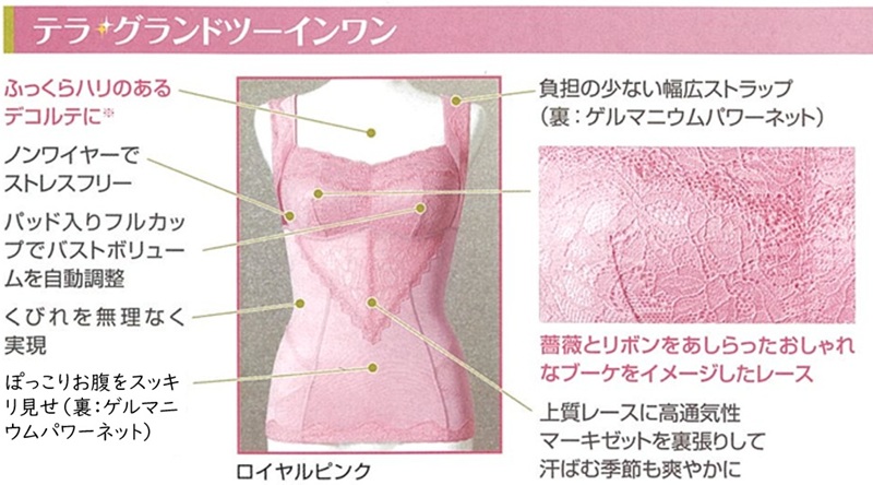 セレブ・サエコ テラシリーズは、「包み込んでボディラインを整える」というセレブ・サエコの特長に、科学的アプローチをプラス。テラヘルツ波*1 の照射加工を施し、ゲルマニウムパワーネットを採用して、若々しいスタイルアップ*2を目指します。アウターにひびきにくく、年齢を問わず綺麗に着こなせる上品でエレガントなナチュラルカラー、「ロイヤルピンク」と「ロイヤルベージュ」の2色が仲間入り。また、レース部分は薔薇とリボンをあしらったおしゃれなブーケをイメージしました。その日の気分にふさわしい色を選んで、ボディラインも気持ちも上げましょう。